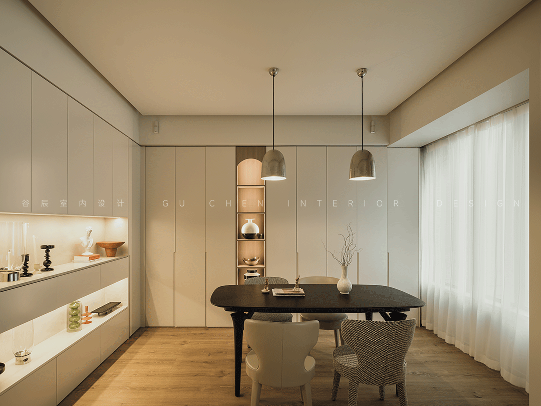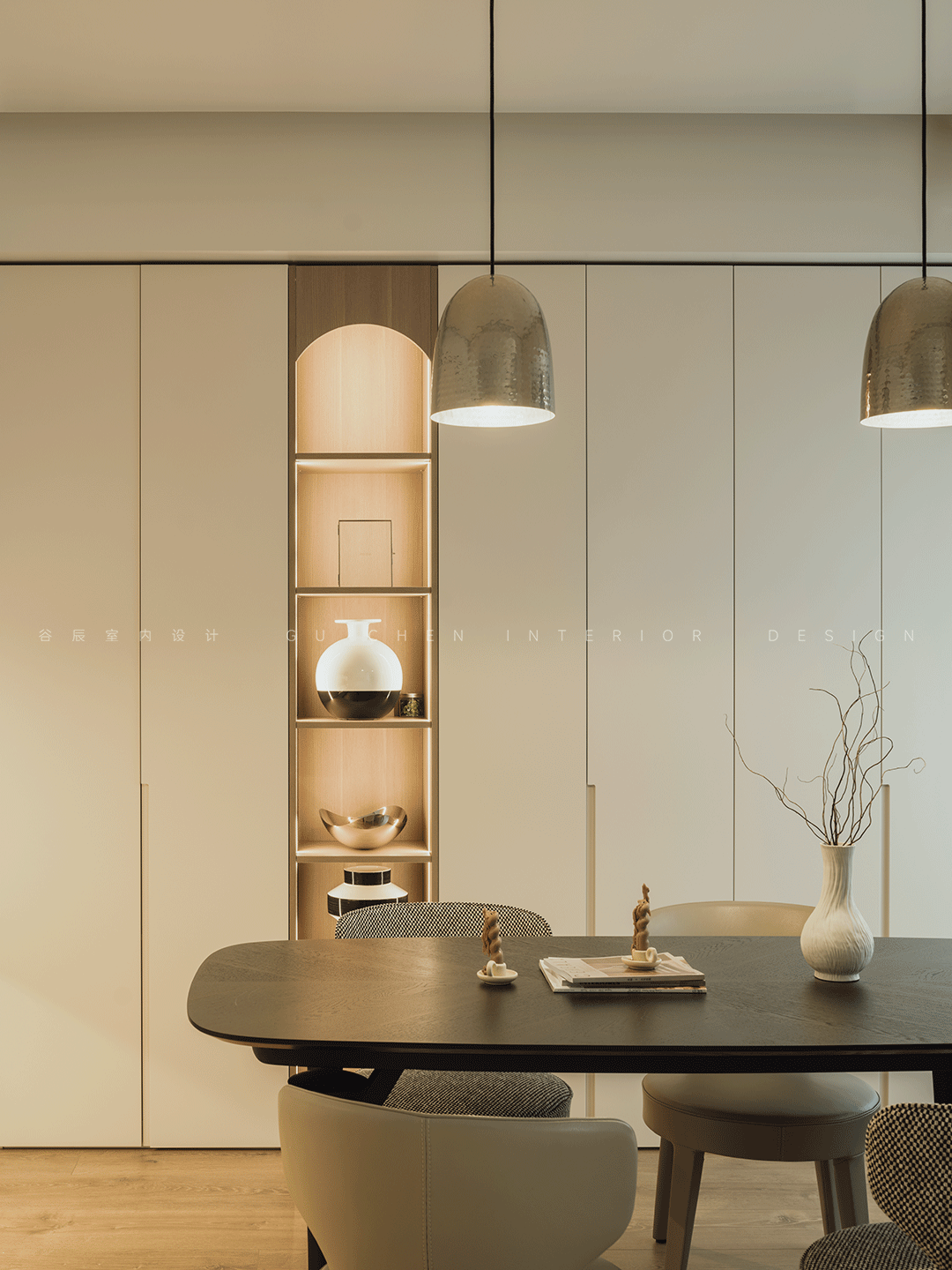 玻璃柜内的隐藏灯带巧妙融入,提升了空间的层次感和艺术气息,更是整个就餐区的视觉焦点,暖色调的吊灯,让独立的餐厅空间也能拥有温馨用餐一隅。