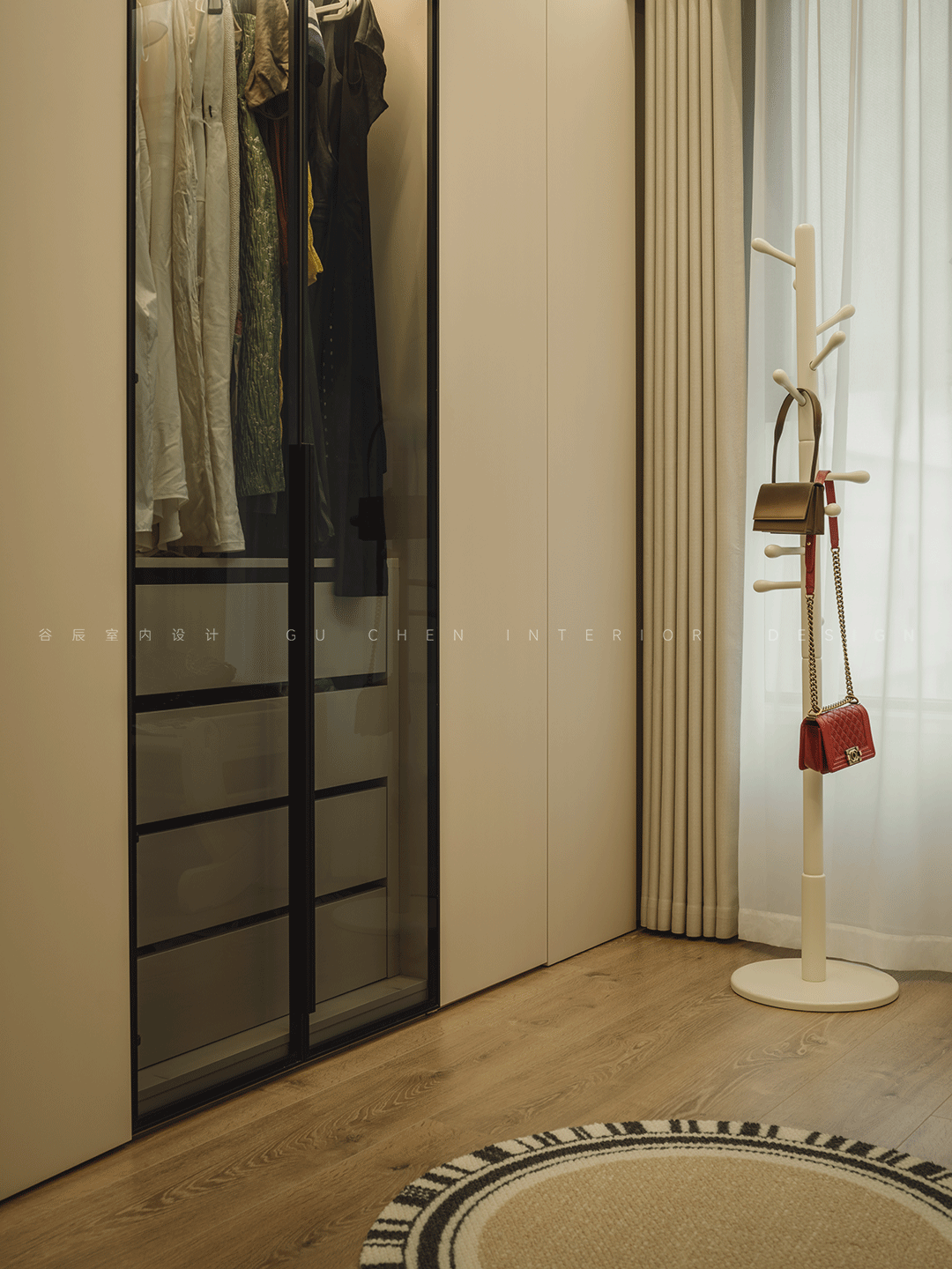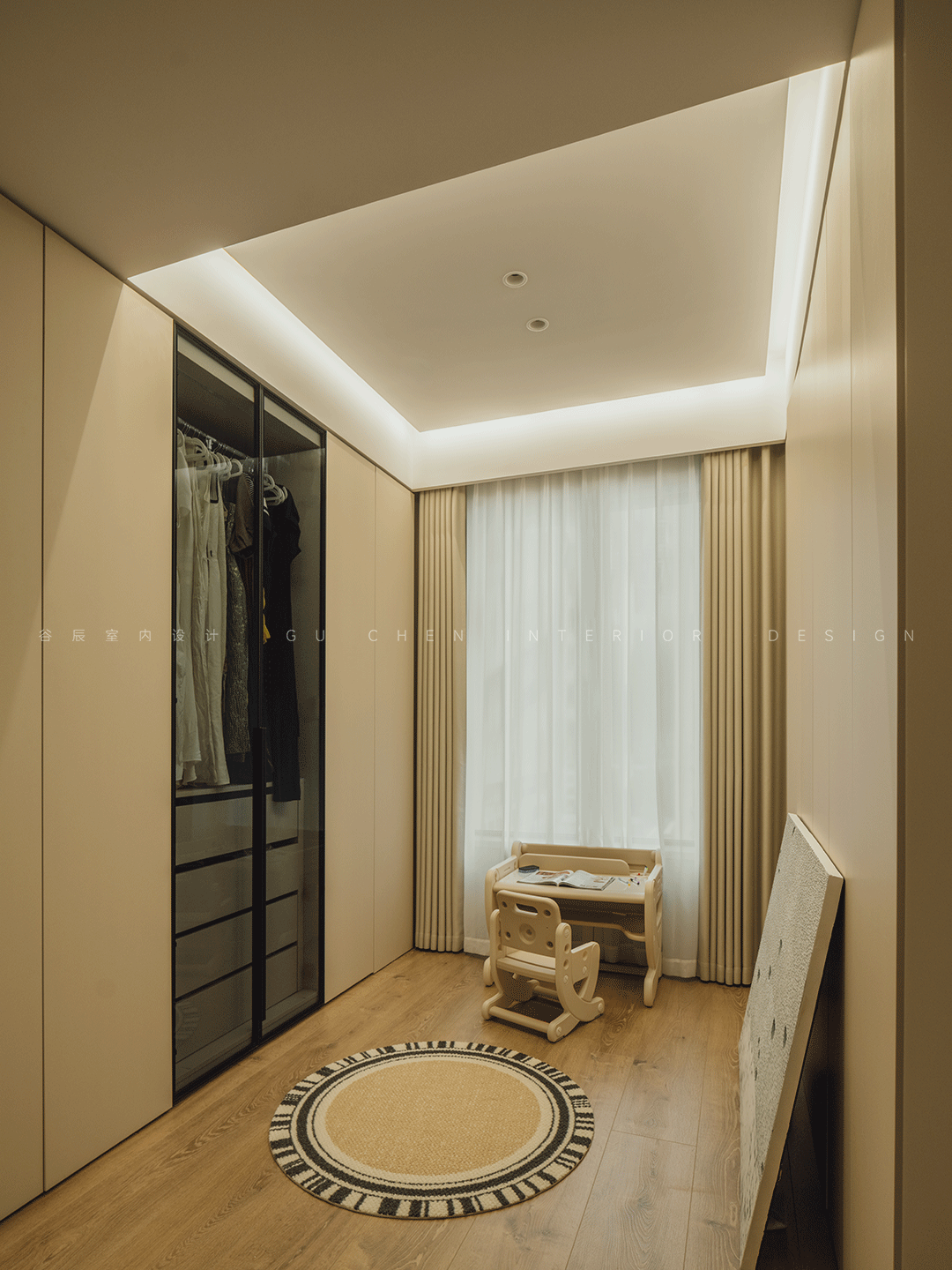 每个女生都期待拥有专属的独立衣帽间,一字型的嵌入式衣柜,有效地节约空间,同时保持了整洁与协调。衣帽间的照明选择了冷白色的灯光,确保了无色差地呈现服饰的每一细节。
