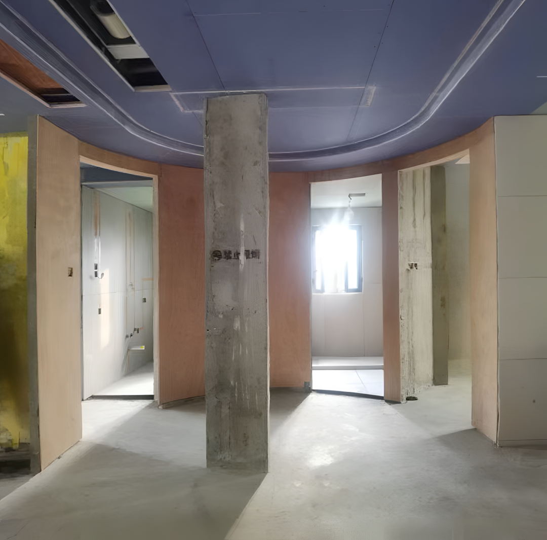 △现场施工图 玄关的施工极其复杂,首先,整个墙体都需要做成弧形的,主卧门,衣帽间的门以及卧室门也要呈现曲线美感;其次,由于木制品和柜子来自不同的供应商,需要不断协调,以确保它们的颜色保持一致性。整个过程需要密切的合作和精湛的手艺,才保证了最终效果的完美呈现。