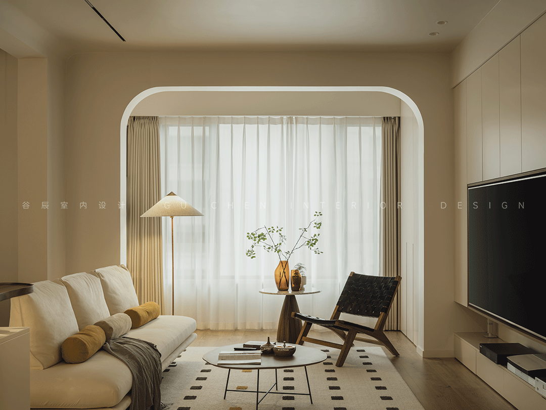 在客厅的角度望去,弧形的玄关设计弱化了视觉的突兀感,让空间看上去更加通透明亮,辅以奶油色的基调,瞬间被舒服高级的治愈感拿捏了。 02客厅 「温柔又克制,是目之所及的温暖」