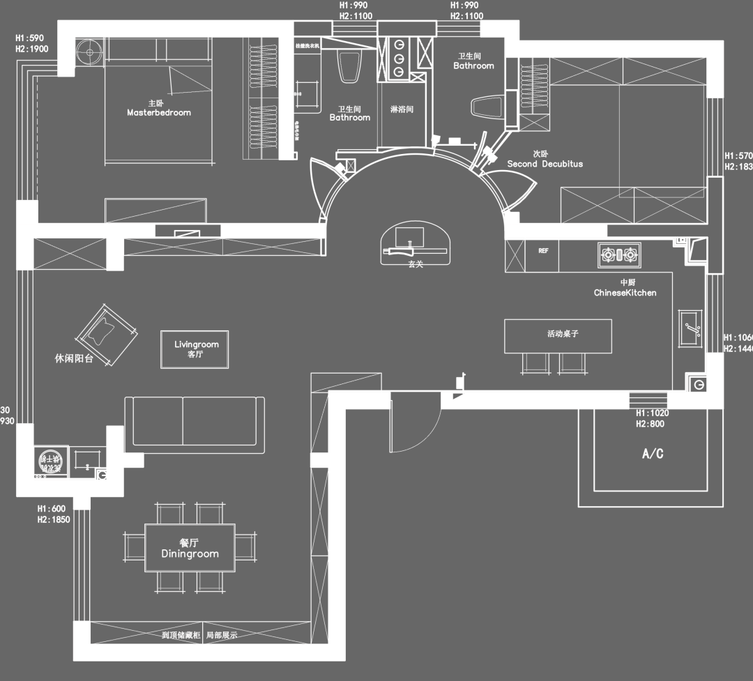 客卫同样做了干湿分离的设计,黑色简约边框淋浴室,使空间展现出别致的设计感。特别值得一提的是,在马桶上方设计的毛巾置物架,这一细节体现了对空间利用的精妙思考。 09户型设计 「设计改动」