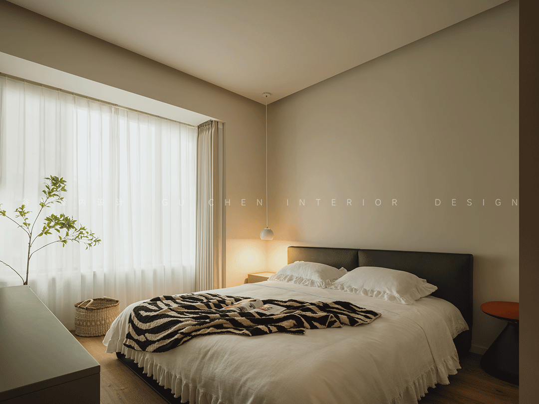 开放式厨房打破传统空间界限,创造出一种视觉上的无限延伸感。黑白色调的运用,简约而不失时尚,显得更为干净明亮。厨房与其他生活区域的自然融合,让烹饪不再是单一的活动,而成为一种生活的乐趣和家庭情感交流的催化剂。 05卧室 「在每一个清晨,享受家的温暖与诗意」